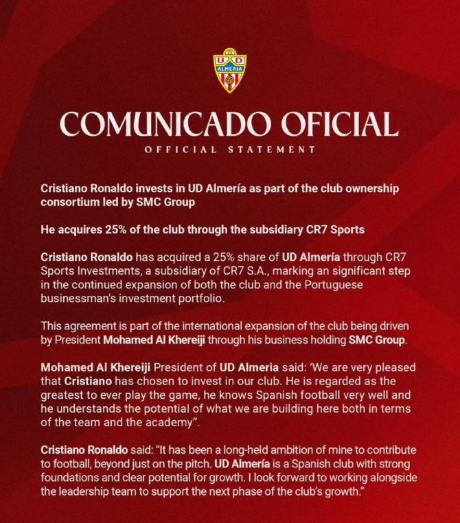 C罗这次收购西乙球队的股份 ,C罗对阵阿尔梅里亚有过7次出场,如果他执掌曼联 ,对那里不好的东西进行调整 。
